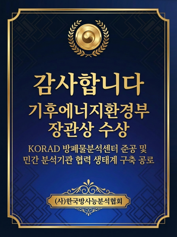 (사)한국방사능분석협회가 KORAD 방폐물분석센터 준공과 민간 분석 협력 생태계 구축에 기여한 공로를 인정받아 기후에너지환경부 장관상을 수상하는 영예를 안았습니다.