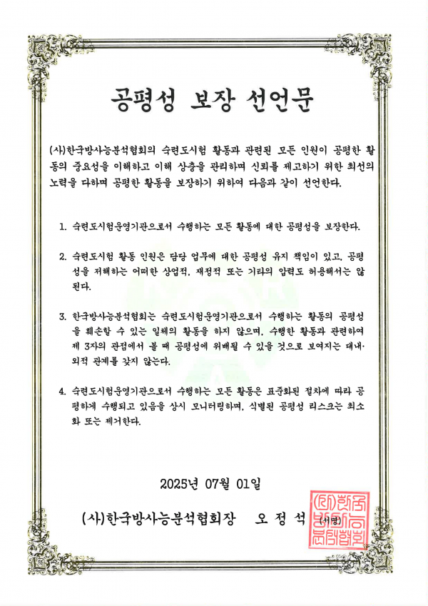 (사)한국방사능분석협회는 숙련도시험 운영기관으로서 숙련도시험 운영의 공평성과 신뢰성을 확보하기 위하여 다음과 같이 공평성 보장 선언문을 공지합니다.